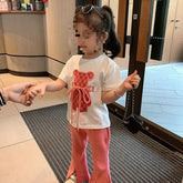 Summer Baby Girls Clothes Set Toddler Kid Cartoon Bear Tshirt and Flared Pants Suit Children Short Sleeve Top Bottom Tracksuit